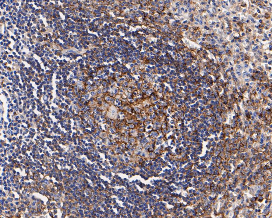 Immunohistochemical analysis of paraffin-embedded human spleen tissue using anti-CD35 antibody. The section was pre-treated using heat mediated antigen retrieval with Tris-EDTA buffer (pH 8.0-8.4) for 20 minutes.The tissues were blocked in 5% BSA for 30 minutes at room temperature, washed with ddH2O and PBS, and then probed with the primary antibody (ER2001-14, 1/200) for 30 minutes at room temperature. The detection was performed using an HRP conjugated compact polymer system. DAB was used as the chromogen. Tissues were counterstained with hematoxylin and mounted with DPX.