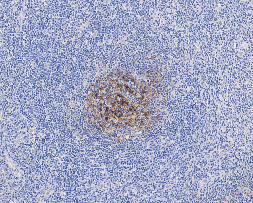 Immunohistochemical analysis of paraffin-embedded human Hodgkin lymphoma tissue with Mouse anti-CD35 antibody (HA601022) at 1/1,000 dilution.