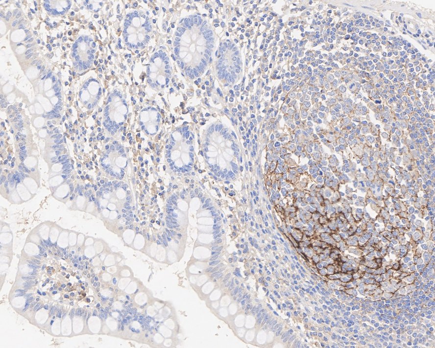 Immunohistochemical analysis of paraffin-embedded human small intestine tissue with Mouse anti-CD35 antibody (HA601022) at 1/1,000 dilution.