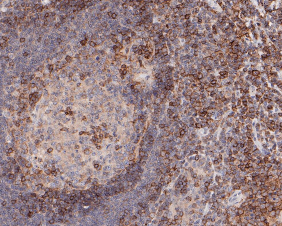 Immunohistochemical analysis of paraffin-embedded human spleen tissue using anti-CD43 antibody. The section was pre-treated using heat mediated antigen retrieval with sodium citrate buffer (pH 6.0) (high pressure) for 2 minutes. The tissues were blocked in 5% BSA for 30 minutes at room temperature, washed with ddH2O and PBS, and then probed with the primary antibody (ER1901-28, 1/100) for 30 minutes at room temperature. The detection was performed using an HRP conjugated compact polymer system. DAB was used as the chromogen. Tissues were counterstained with hematoxylin and mounted with DPX.