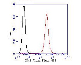 Flow cytometric analysis of CD43 was done on Jurkat cells. The cells were fixed, permeabilized and stained with the primary antibody (ER1901-28, 1/50) (red). After incubation of the primary antibody at room temperature for an hour, the cells were stained with a Alexa Fluor 488-conjugated goat anti-rabbit IgG Secondary antibody at 1/1000 dilution for 30 minutes.Unlabelled sample was used as a control (cells without incubation with primary antibody; black).
