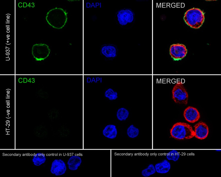 Immunocytochemistry analysis of U-937 (positive) and HT-29 (negative) labeling CD43 with Mouse anti-CD43 antibody (HA601286) at 1/250 dilution.