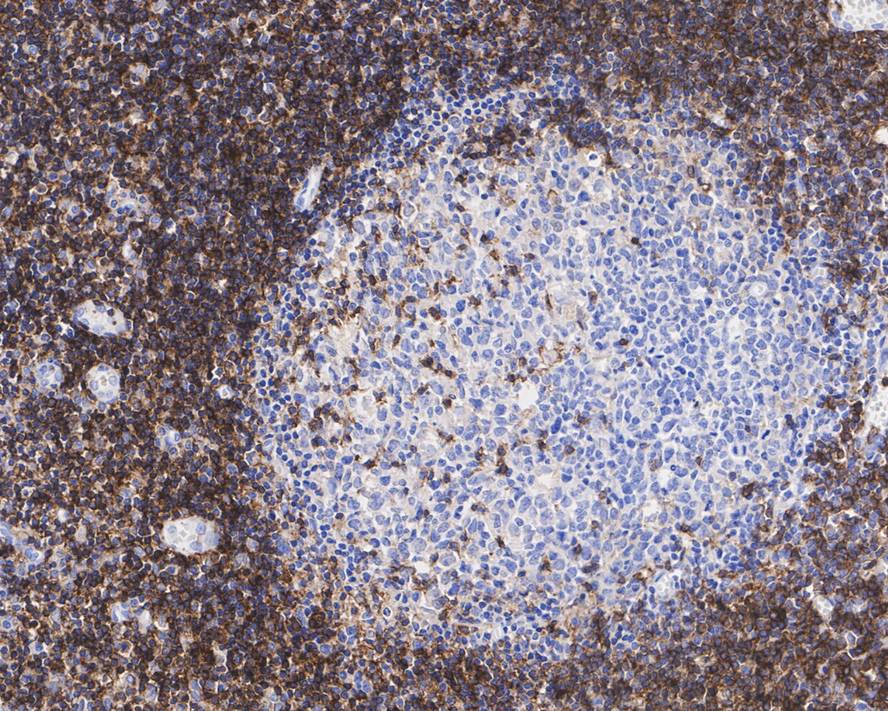 Immunohistochemical analysis of paraffin-embedded human tonsil tissue with Mouse anti-CD43 antibody (HA601286) at 1/1,000 dilution.