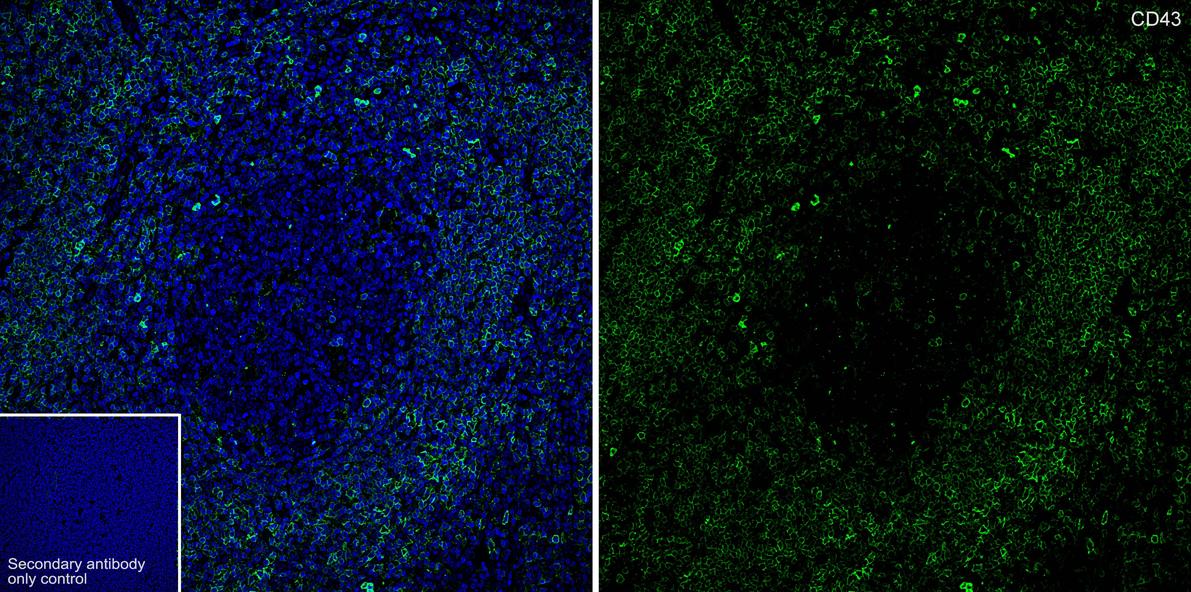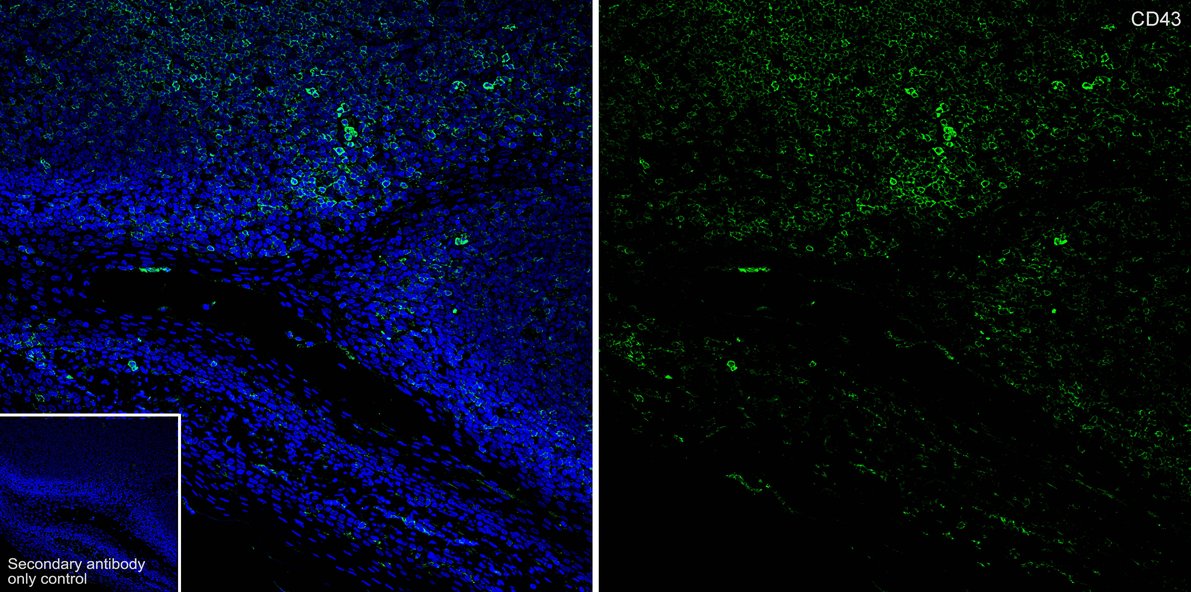 Cells were fixed in 4% paraformaldehyde for 20 minutes at room temperature, permeabilized with 0.1% Triton X-100 in PBS for 5 minutes at room temperature, then blocked with 1% BSA in 10% negative goat serum for 1 hour at room temperature. Cells were then incubated with Mouse anti-CD43 antibody (HA601286) at 1/250 dilution in 1% BSA in PBST overnight at 4 ℃. Goat Anti-Mouse IgG H&L (iFluor™ 488, HA1125) was used as the secondary antibody at 1/1,000 dilution. PBS instead of the primary antibody was used as the secondary antibody only control. Nuclear DNA was labelled in blue with DAPI.