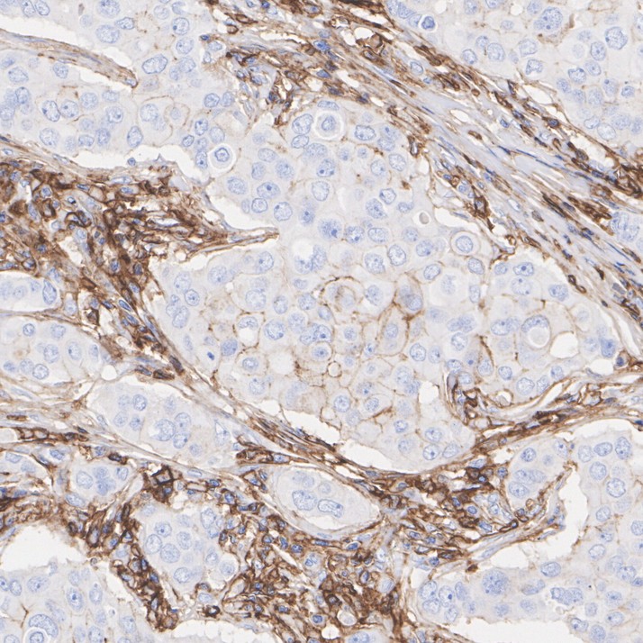 Immunohistochemical analysis of paraffin-embedded human breast cancer tissue with Rabbit anti-CD44 antibody (ET1609-74) at 1/1,000 dilution.