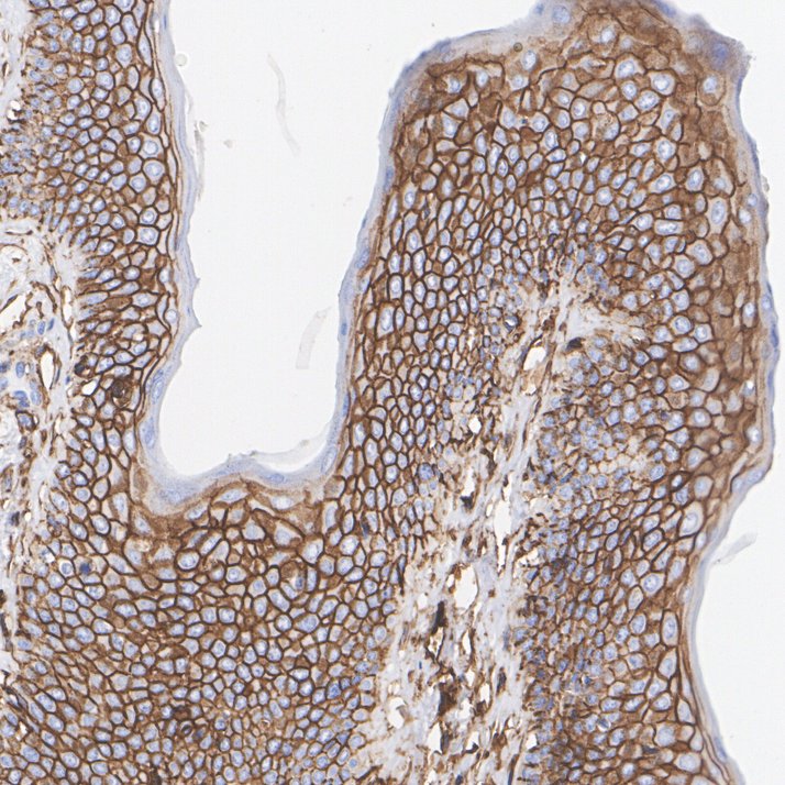 Immunohistochemical analysis of paraffin-embedded human skin tissue with Rabbit anti-CD44 antibody (ET1609-74) at 1/1,000 dilution.
