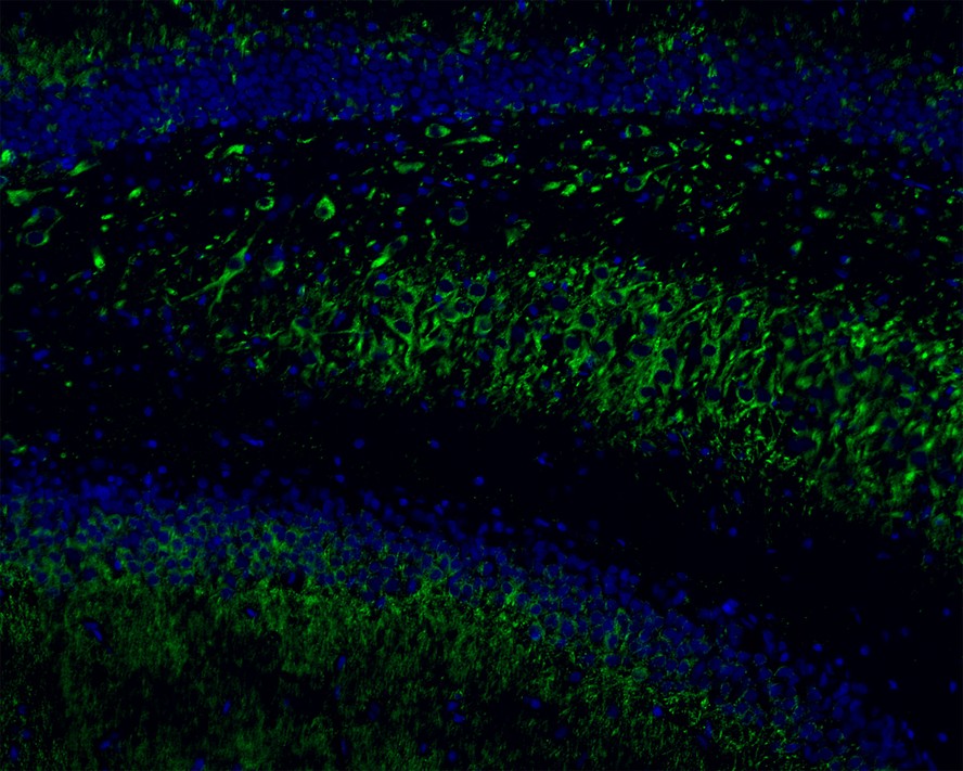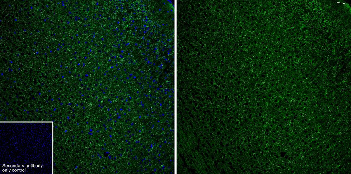 Immunofluorescence analysis of frozen mouse hippocampus tissue labeling CD90 / THY1 with Rabbit anti-CD90 / THY1 antibody (HA750364).