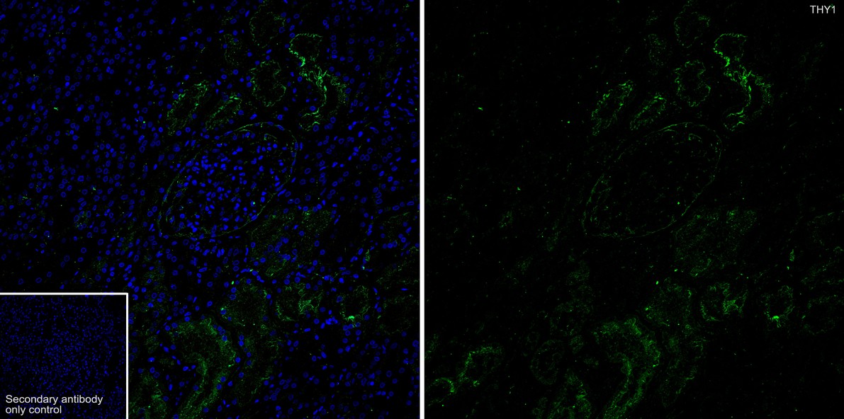 Immunofluorescence analysis of paraffin-embedded human kidney tissue labeling CD90 / THY1 with Rabbit anti-CD90 / THY1 antibody (HA750364) at 1/400 dilution.