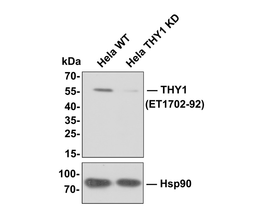 Lane 2: THY1 knockdown Hela whole cell lysate (10 µg).