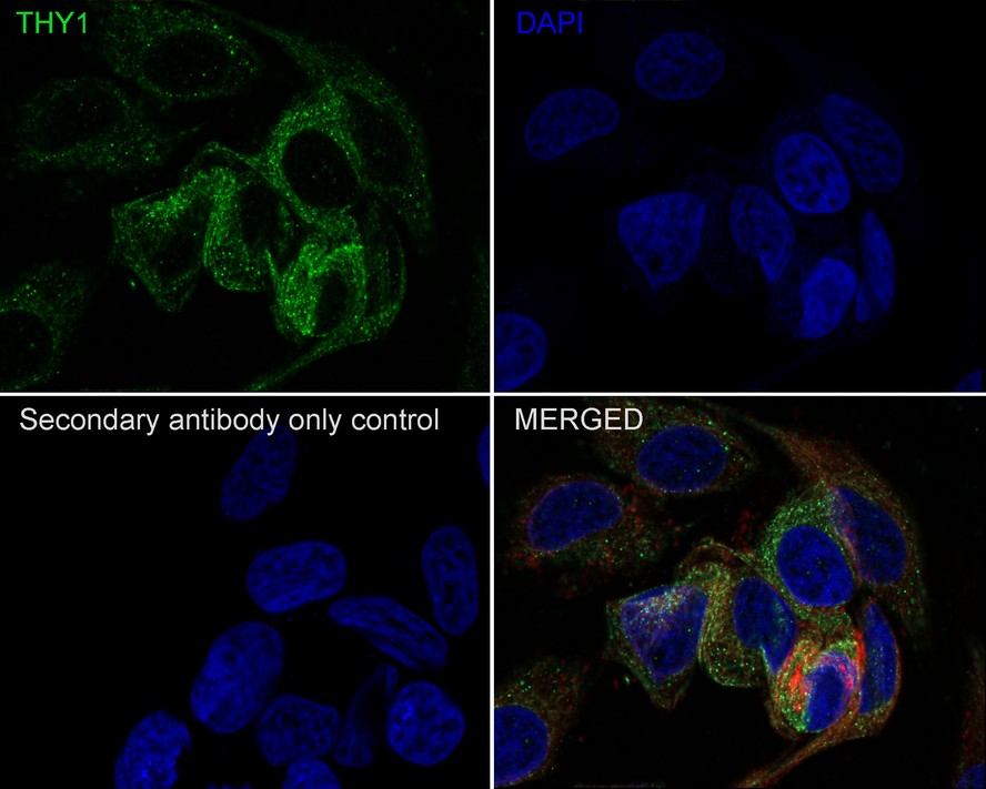Immunocytochemistry analysis of HeLa cells labeling CD90 / THY1 with Rabbit anti-CD90 / THY1 antibody (HA750364) at 1/200 dilution.