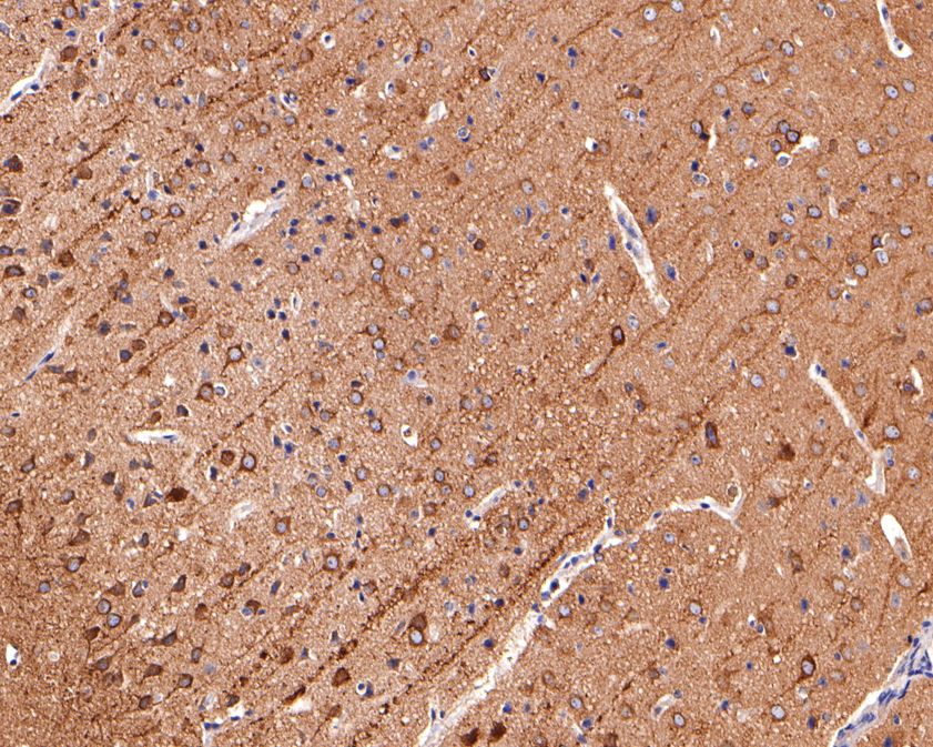 Immunohistochemical analysis of paraffin-embedded mouse brain tissue using anti-CD90 / THY1 antibody. The section was pre-treated using heat mediated antigen retrieval with Tris-EDTA buffer (pH 9.0) for 20 minutes.The tissues were blocked in 1% BSA for 30 minutes at room temperature, washed with ddH2O and PBS, and then probed with the primary antibody (HA750364, 1/400) for 30 minutes at room temperature. The detection was performed using an HRP conjugated compact polymer system. DAB was used as the chromogen. Tissues were counterstained with hematoxylin and mounted with DPX.