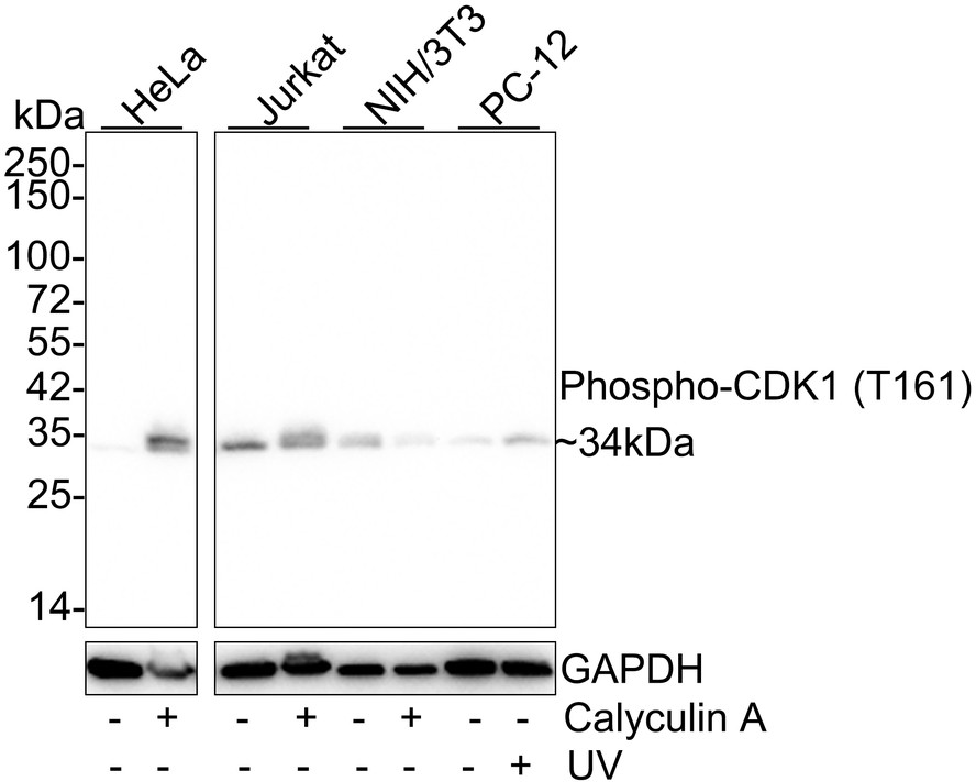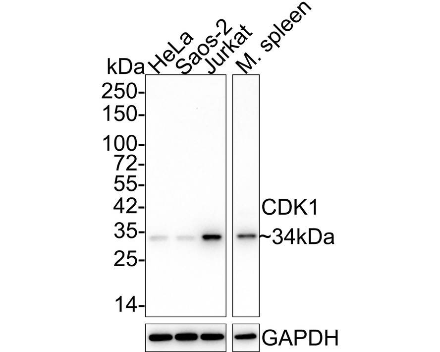 Western blot analysis of CDK1 on different lysates with Rabbit anti-CDK1 antibody (ET1607-51) at 1/1,000 dilution.