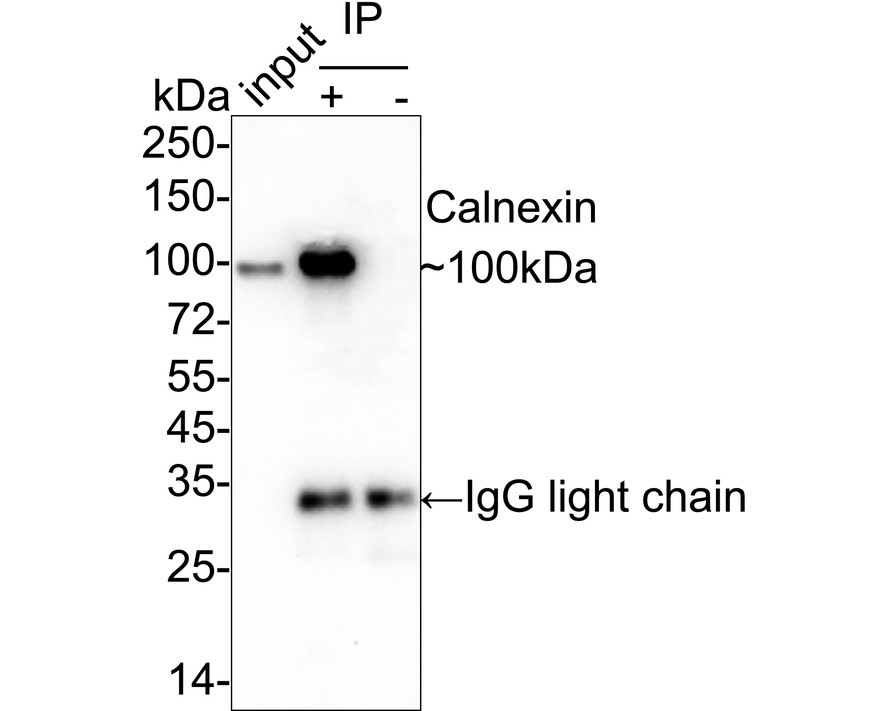 Calnexin was immunoprecipitated from 0.2 mg HeLa cell lysate with HA750275 at 2 µg/10 µl beads. Western blot was performed from the immunoprecipitate using HA750275 at 1/1,000 dilution. Anti-Rabbit IgG for IP Nano-secondary antibody (NBI01H) at 1/5,000 dilution was used for 1 hour at room temperature.