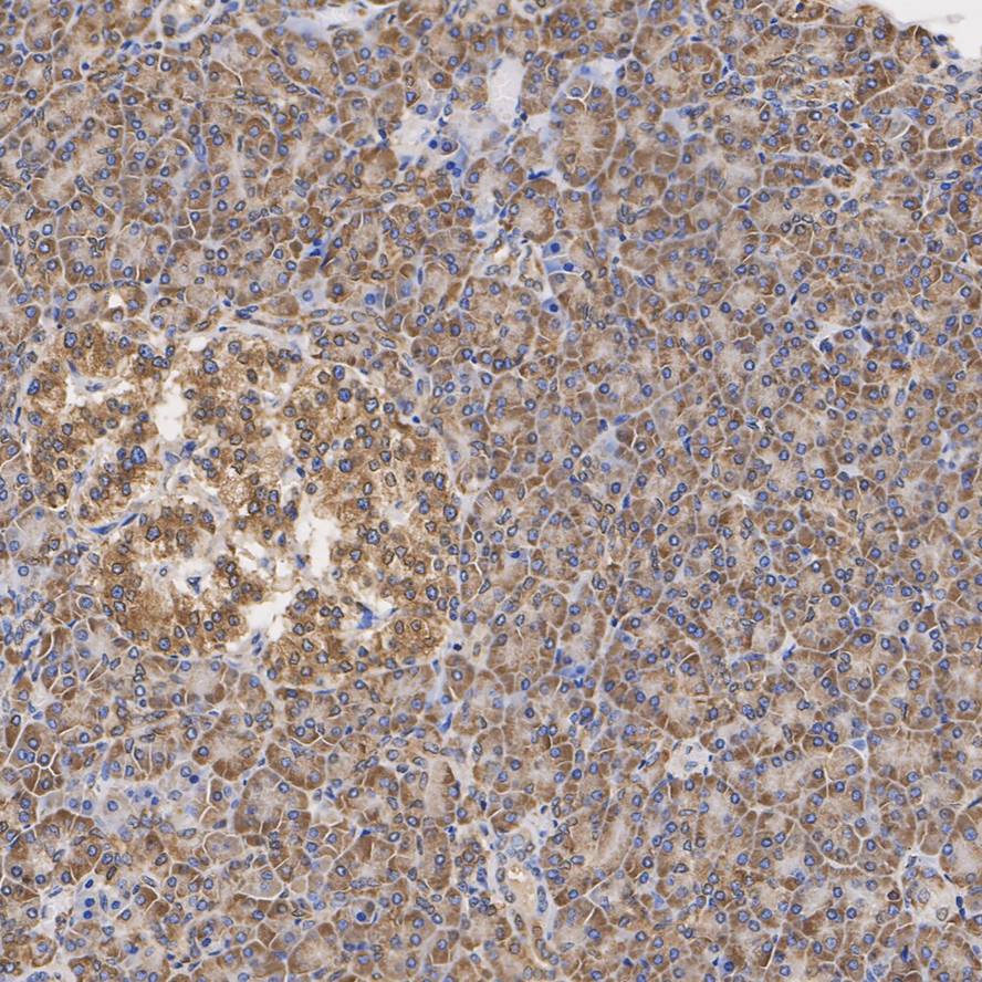 Immunohistochemical analysis of paraffin-embedded human pancreas tissue with Rabbit anti-Calnexin antibody (HA750275) at 1/2,000 dilution.