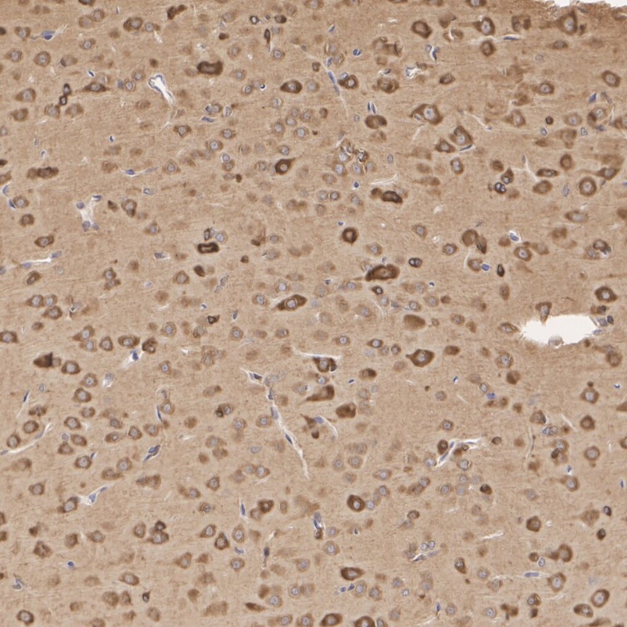 The section was pre-treated using heat mediated antigen retrieval with Tris-EDTA buffer (pH 9.0) for 20 minutes. The tissues were blocked in 1% BSA for 20 minutes at room temperature, washed with ddH2O and PBS, and then probed with the primary antibody (HA750275) at 1/10,000 dilution for 1 hour at room temperature. The detection was performed using an HRP conjugated compact polymer system. DAB was used as the chromogen. Tissues were counterstained with hematoxylin and mounted with DPX.