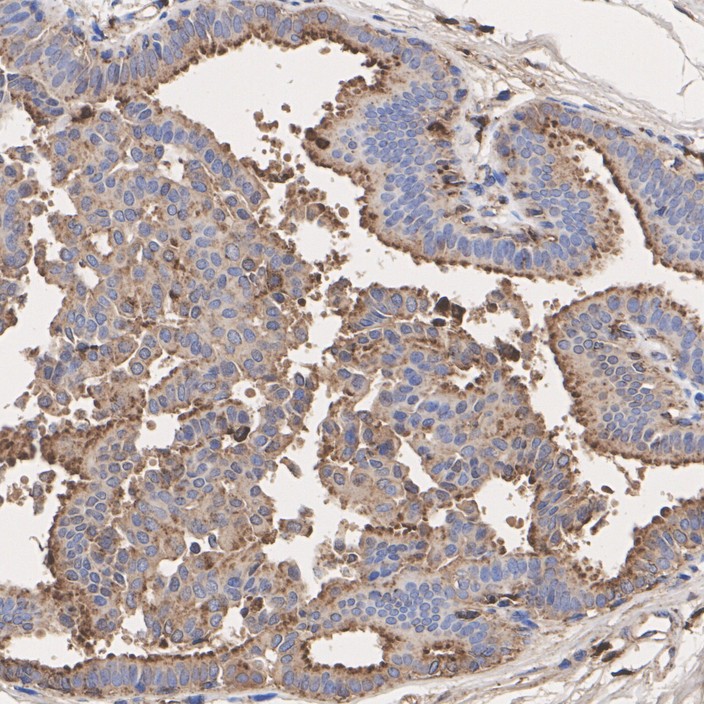 Immunohistochemical analysis of paraffin-embedded human breast cancer tissue with Rabbit anti-Cathepsin D antibody (HA750152) at 1/3,000 dilution.
