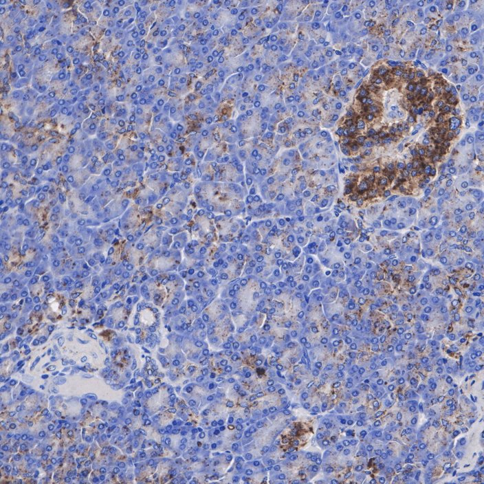 Immunohistochemical analysis of paraffin-embedded human pancreas tissue with Rabbit anti-Cathepsin D antibody (HA750152) at 1/3,000 dilution.