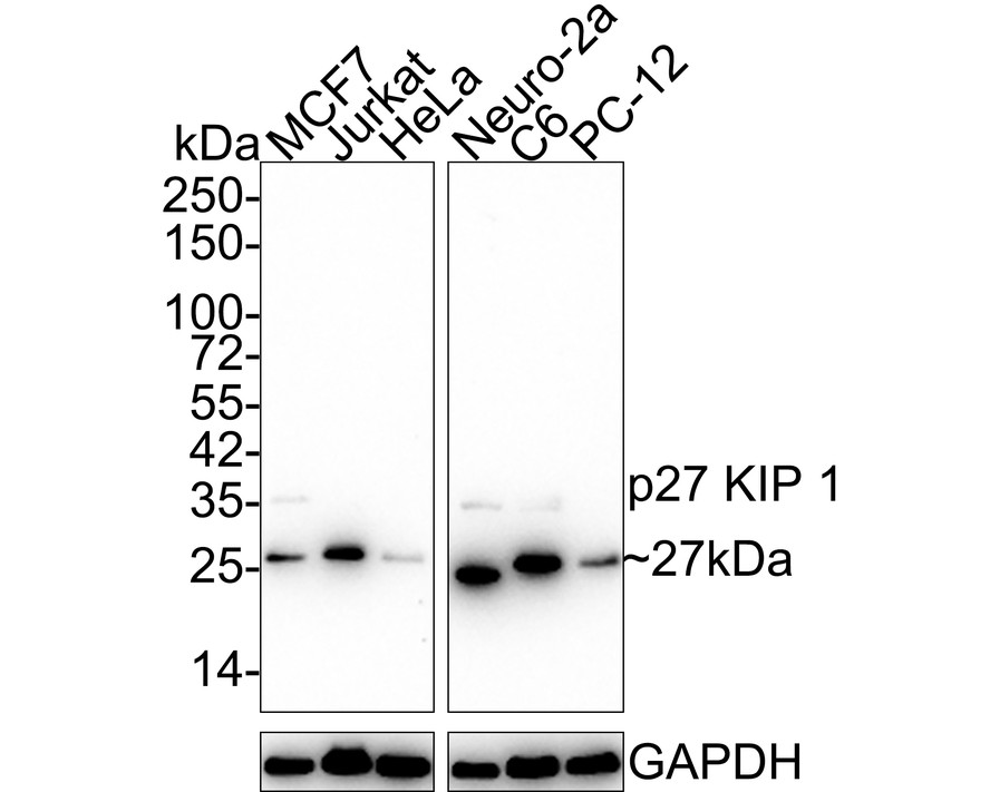 Western blot analysis of p27 KIP 1 on different lysates with Rabbit anti-p27 KIP 1 antibody (ET1608-61) at 1/2,000 dilution.