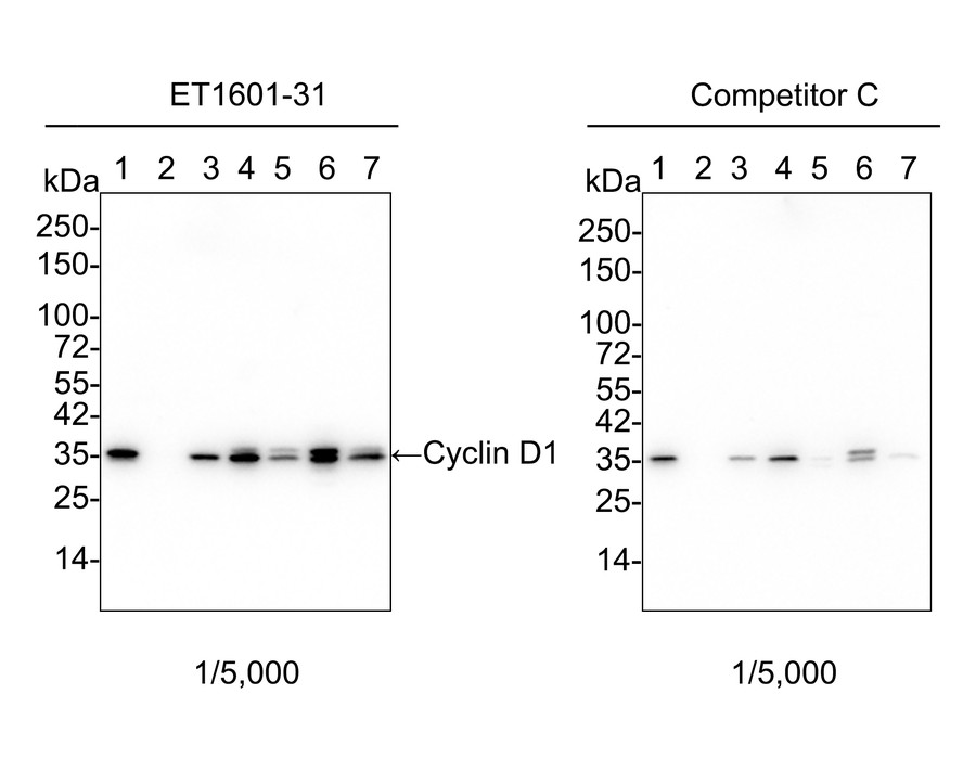 Western blot analysis of Cyclin D1 on different lysates with Rabbit anti-Cyclin D1 antibody (ET1601-31) at 1/5,000 dilution and competitor's antibody at 1/5,000 dilution.