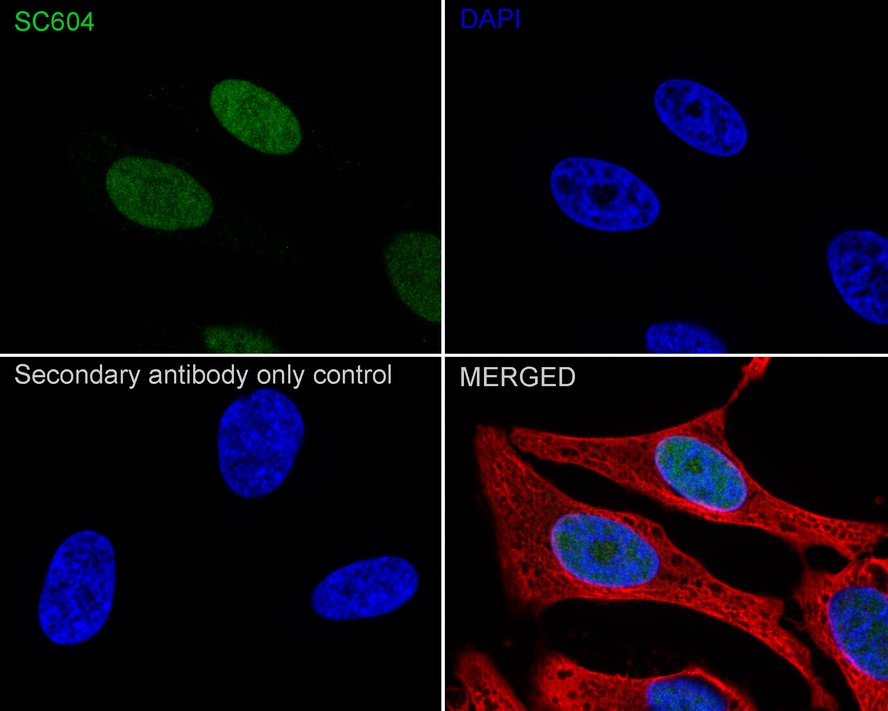 Cells were fixed in 4% paraformaldehyde for 15 minutes at room temperature, permeabilized with 0.1% Triton X-100 in PBS for 15 minutes at room temperature, then blocked with 1% BSA in 10% negative goat serum for 1 hour at room temperature. Cells were then incubated with Rabbit anti-Chk2 antibody (HA750223) at 1/50 dilution in 1% BSA in PBST overnight at 4 ℃. Goat Anti-Rabbit IgG H&L (iFluor™ 488, HA1121) was used as the secondary antibody at 1/1,000 dilution. PBS instead of the primary antibody was used as the secondary antibody only control. Nuclear DNA was labelled in blue with DAPI.