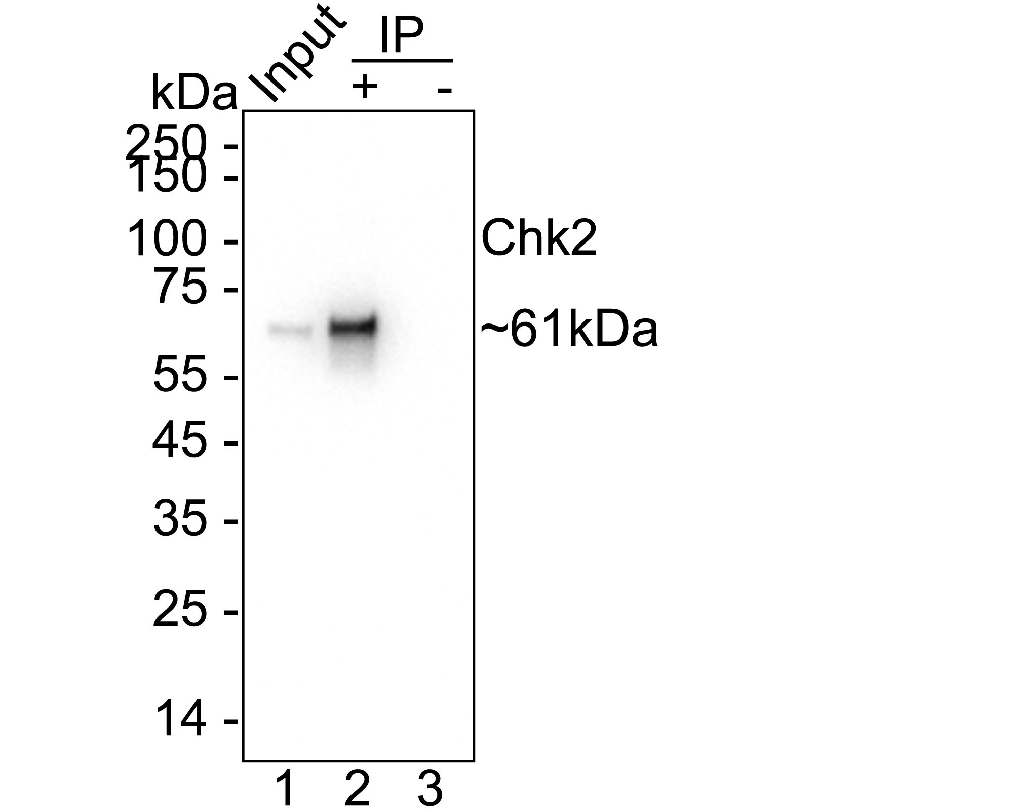 Chk2 was immunoprecipitated from 0.2 mg A549 cell lysate with HA750223 at 2 µg/10 µl beads. Western blot was performed from the immunoprecipitate using HA750223 at 1/2,000 dilution. HRP Conjugated Anti-Rabbit IgG for IP Nano-secondary antibody at 1/5,000 dilution was used for 1 hour at room temperature.