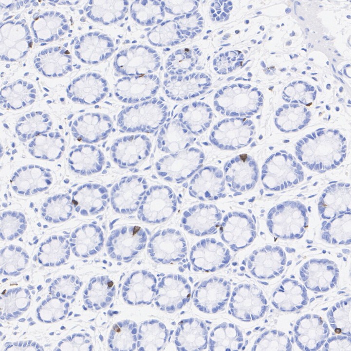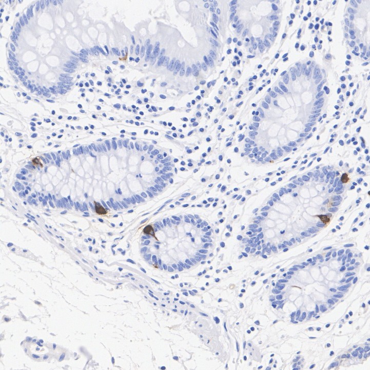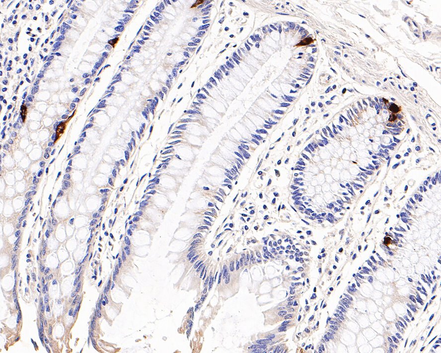 Immunohistochemical analysis of paraffin-embedded mouse colon tissue with Rabbit anti-Chromogranin A antibody (ET1703-08) at 1/1,000 dilution.