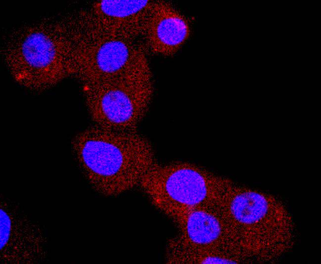 ICC staining Chromogranin A in PC-3M cells (red). The nuclear counter stain is DAPI (blue). Cells were fixed in paraformaldehyde, permeabilised with 0.25% Triton X100/PBS.