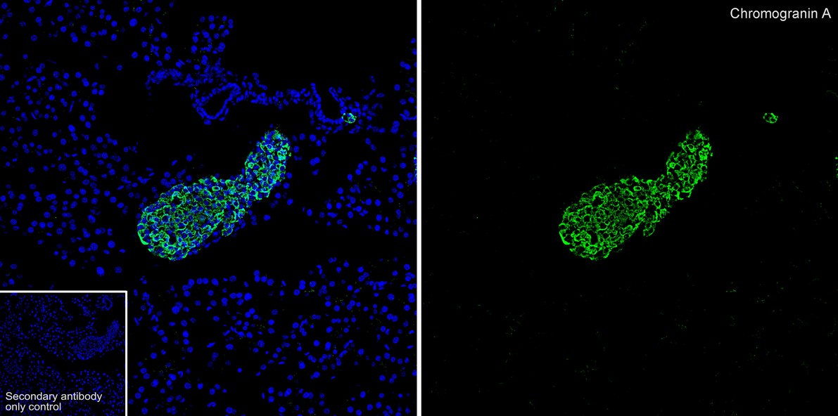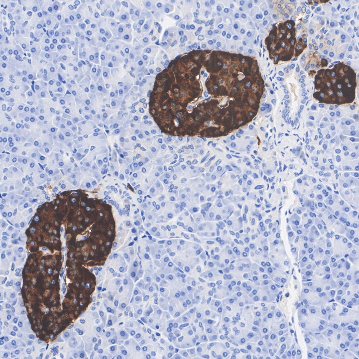 Immunohistochemical analysis of paraffin-embedded rat pancreas tissue with Rabbit anti-Chromogranin A antibody (ET1703-08) at 1/10,000 dilution.