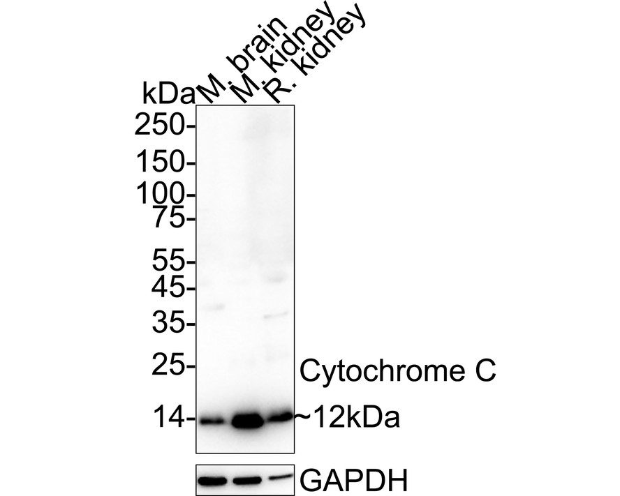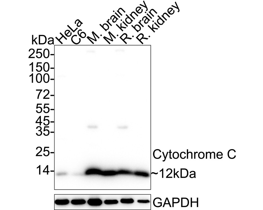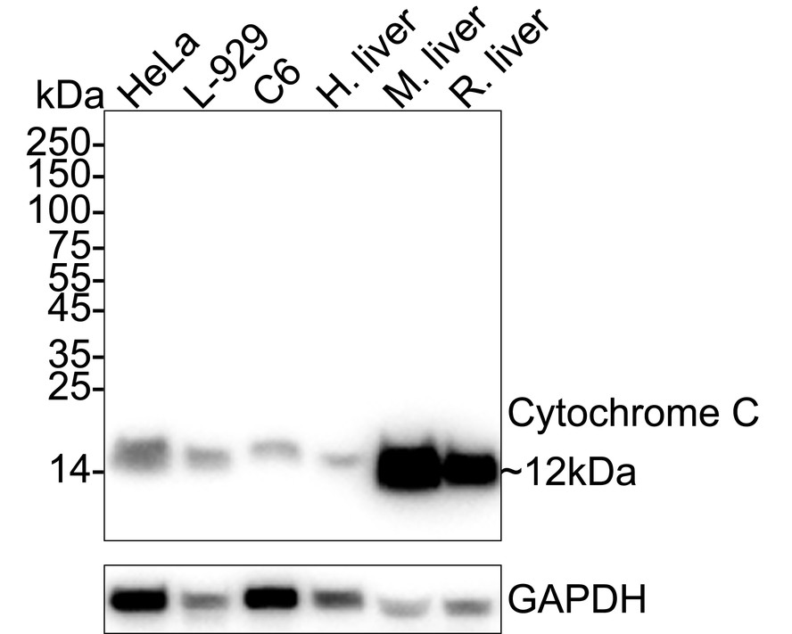 Western blot analysis of Cytochrome C on different lysates with Rabbit anti-Cytochrome C antibody (ET1610-60) at 1/2,000 dilution.