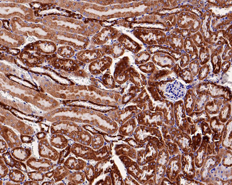 Immunohistochemical analysis of paraffin-embedded mouse kidney tissue with Rabbit anti-Cytochrome C antibody (ET1610-60) at 1/1,000 dilution.