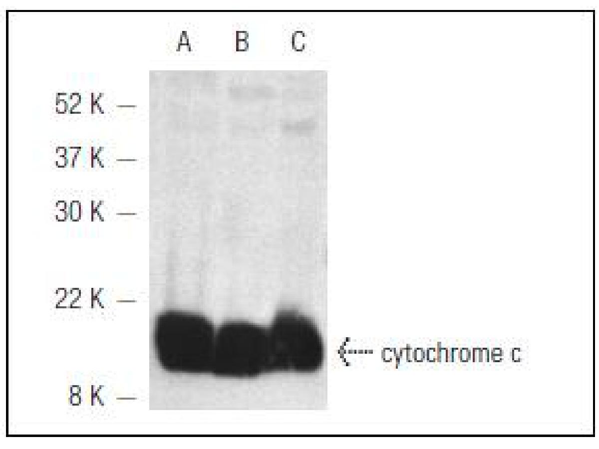 Cytochrome c is a well characterized mobile electron transport protein that is essential to energy conversion in all aerobic organisms. In mammalian cells, this highly conserved protein is normally localized to the mitochondrial intermembrane space. More recent studies have identifed cytosolic cytochrome c as a factor necessary for activation of apoptosis. During apoptosis, cytochrome c is translocated from the mitochondrial membrane to the cytosol, where it is required for activation of caspase-3 (CPP32). Overexpression of Bcl-2 has been shown to prevent the translocation of cytochrome c, thereby blocking the apoptotic process. Overexpression of Bax has been shown to induce the release of cytochrome c and to induce cell death. The release of cytochrome c from the mitochondria is thought to trigger an apoptotic cascade, whereby Apaf-1 binds to Apaf-3 (caspase-9) in a cytochrome c-dependent manner, leading to caspase-9 cleavage of caspase-3.