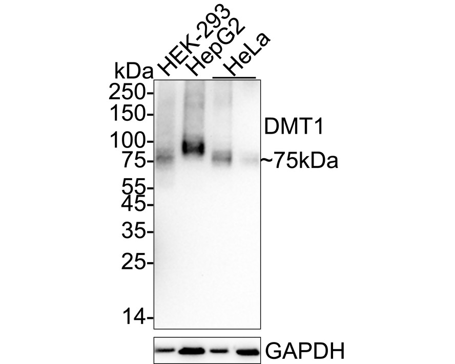Western blot analysis of DMT1 on different lysates with Rabbit anti-DMT1 antibody (HA723078) at 1/2,000 dilution.
