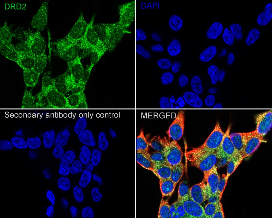 Cells were fixed in 4% paraformaldehyde for 15 minutes at room temperature, permeabilized with 0.1% Triton X-100 in PBS for 15 minutes at room temperature, then blocked with 1% BSA in 10% negative goat serum for 1 hour at room temperature. Cells were then incubated with Rabbit anti-Dopamine D2 Receptor antibody (HA751324) at 1/100 dilution in 1% BSA in PBST overnight at 4 ℃. Goat Anti-Rabbit IgG H&L (iFluor™ 488, HA1121) was used as the secondary antibody at 1/1,000 dilution. PBS instead of the primary antibody was used as the secondary antibody only control. Nuclear DNA was labelled in blue with DAPI.