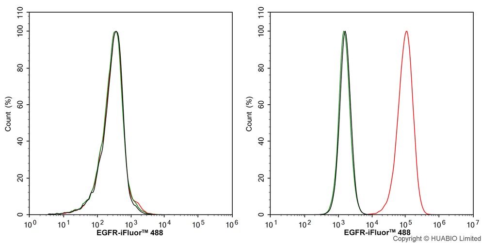 Flow cytometric analysis of Jurkat (left, negative) and A431 (right, positive) cells labeling EGFR.