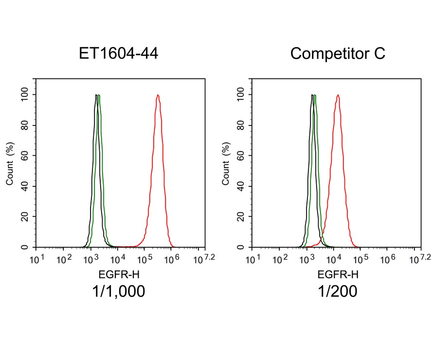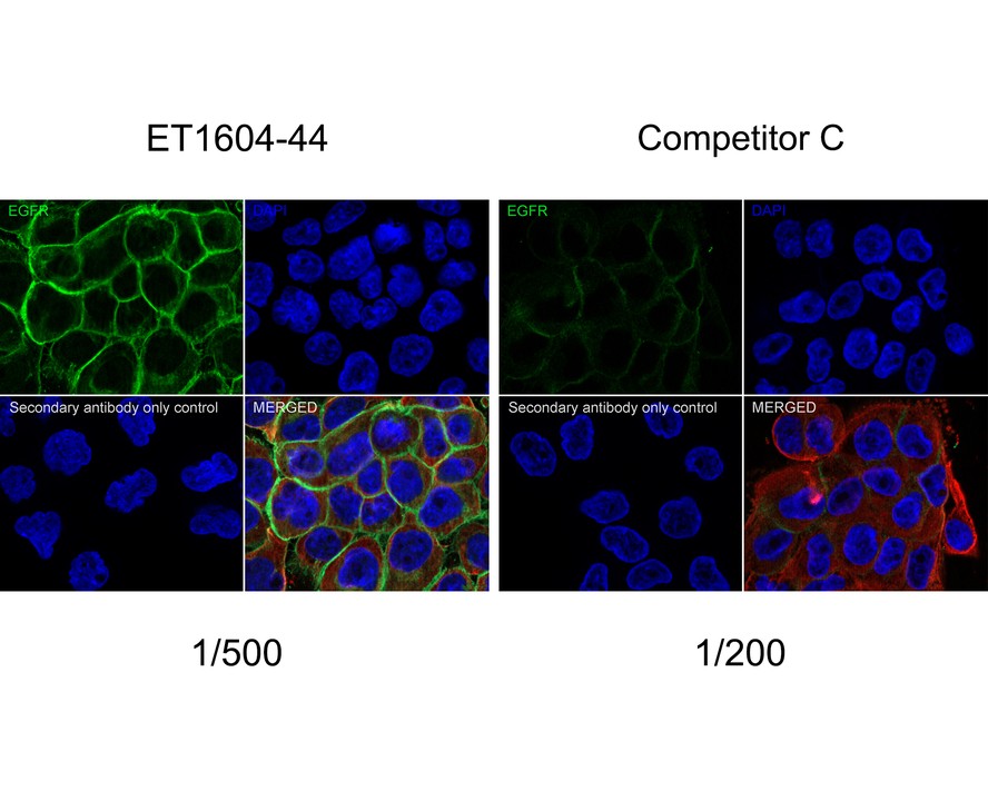 Cells were fixed in 4% paraformaldehyde for 20 minutes at room temperature, permeabilized with 0.1% Triton X-100 in PBS for 5 minutes at room temperature, then blocked with 1% BSA in 10% negative goat serum for 1 hour at room temperature. Cells were then incubated with Rabbit anti-EGFR antibody (HA750078) at 1/500 dilution and competitor's antibody at 1/200 dilution in 1% BSA in PBST overnight at 4 ℃. Goat Anti-Rabbit IgG H&L (iFluor™ 488, HA1121) was used as the secondary antibody at 1/1,000 dilution. PBS instead of the primary antibody was used as the secondary antibody only control. Nuclear DNA was labelled in blue with DAPI.