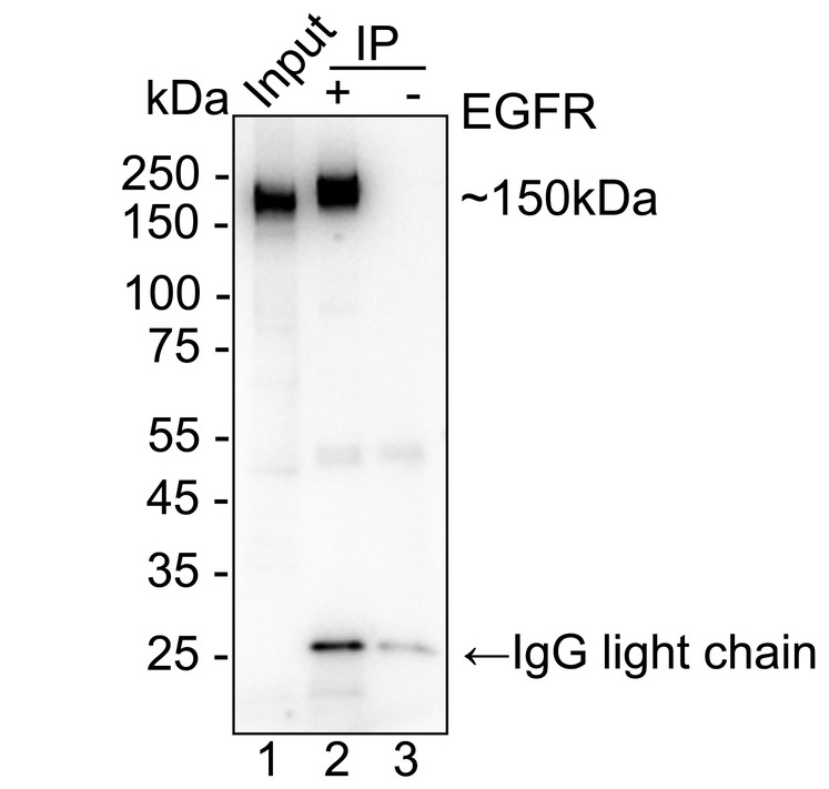 EGFR was immunoprecipitated from 0.2 mg HeLa cell lysate with HA750078 at 2 µg/10 µl beads. Western blot was performed from the immunoprecipitate using HA750078 at 1/1,000 dilution. HRP Conjugated Anti-Rabbit IgG for IP Nano-secondary antibody at 1/5,000 dilution was used for 1 hour at room temperature.