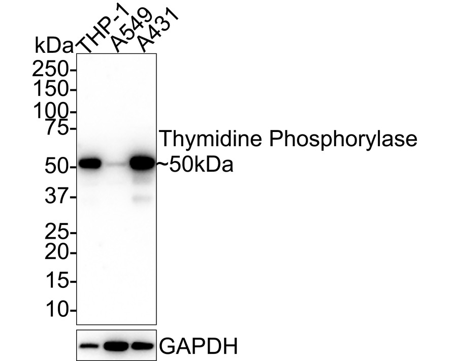 Western blot analysis of Thymidine Phosphorylase on different lysates with Mouse anti-Thymidine Phosphorylase antibody (EM1901-23) at 1/1,000 dilution.
