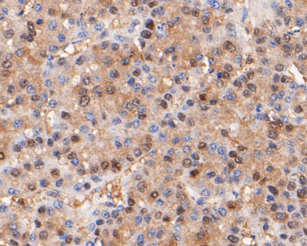 Immunohistochemical analysis of paraffin-embedded human liver carcinoma tissue using anti-Thymidine Phosphorylase antibody. The section was pre-treated using heat mediated antigen retrieval with Tris-EDTA buffer (pH 8.0-8.4) for 20 minutes.The tissues were blocked in 5% BSA for 30 minutes at room temperature, washed with ddH2O and PBS, and then probed with the primary antibody (EM1901-23, 1/200) for 30 minutes at room temperature. The detection was performed using an HRP conjugated compact polymer system. DAB was used as the chromogen. Tissues were counterstained with hematoxylin and mounted with DPX.