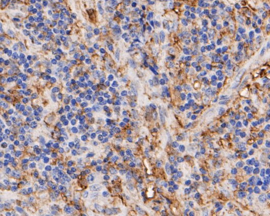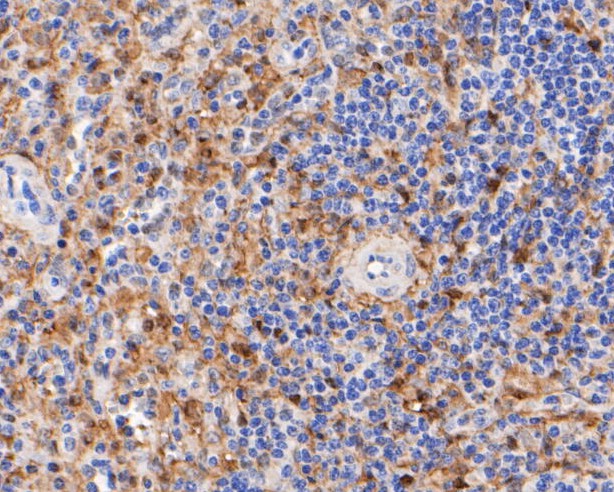 Immunohistochemical analysis of paraffin-embedded human spleen tissue using anti-Thymidine Phosphorylase antibody. The section was pre-treated using heat mediated antigen retrieval with Tris-EDTA buffer (pH 8.0-8.4) for 20 minutes.The tissues were blocked in 5% BSA for 30 minutes at room temperature, washed with ddH2O and PBS, and then probed with the primary antibody (EM1901-23, 1/200) for 30 minutes at room temperature. The detection was performed using an HRP conjugated compact polymer system. DAB was used as the chromogen. Tissues were counterstained with hematoxylin and mounted with DPX.