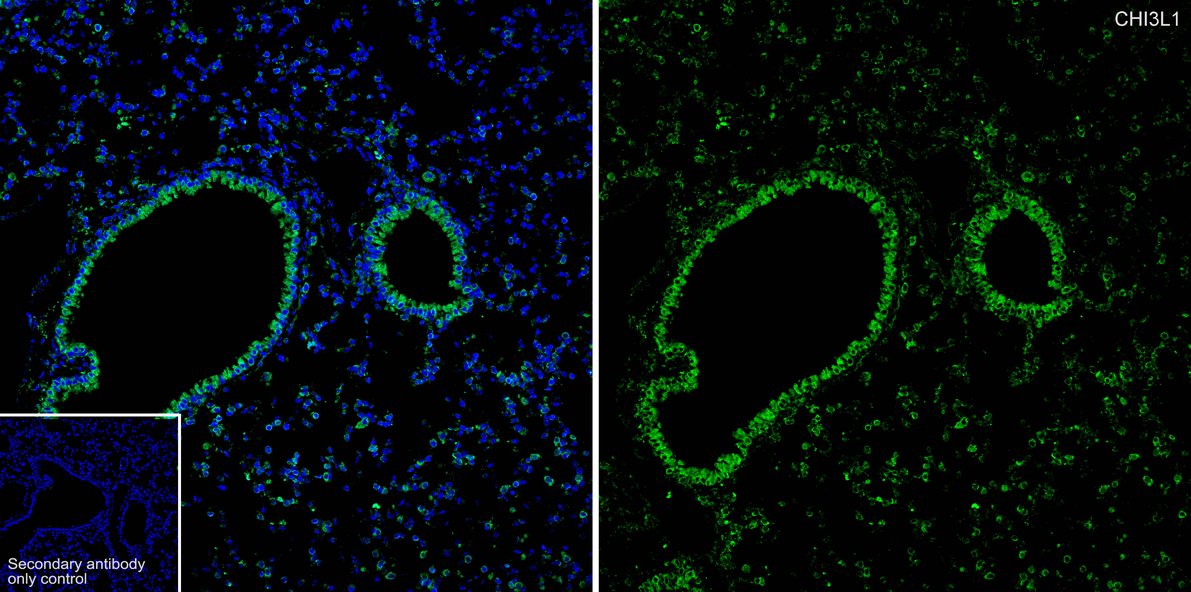 Immunohistochemical analysis of paraffin-embedded mouse lung tissue using anti-YKL-40 / CHI3L1 antibody. The section was pre-treated using heat mediated antigen retrieval with Tris-EDTA buffer (pH 8.0-8.4) for 20 minutes.The tissues were blocked in 5% BSA for 30 minutes at room temperature, washed with ddH2O and PBS, and then probed with the antibody (EM1902-14) at 1/200 dilution, for 30 minutes at room temperature and detected using an HRP conjugated compact polymer system. DAB was used as the chrogen. Counter stained with hematoxylin and mounted with DPX.