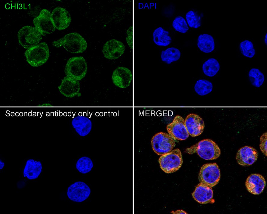 Cells were fixed in 4% paraformaldehyde for 20 minutes at room temperature, permeabilized with 0.1% Triton X-100 in PBS for 5 minutes at room temperature, then blocked with 1% BSA in 10% negative goat serum for 1 hour at room temperature. Cells were then incubated with Mouse anti-YKL-40 / CHI3L1 antibody (EM1902-14) at 1/100 dilution in 1% BSA in PBST overnight at 4 ℃. Goat Anti-Mouse IgG H&L (iFluor™ 488, HA1125) was used as the secondary antibody at 1/1,000 dilution. PBS instead of the primary antibody was used as the secondary antibody only control. Nuclear DNA was labelled in blue with DAPI.