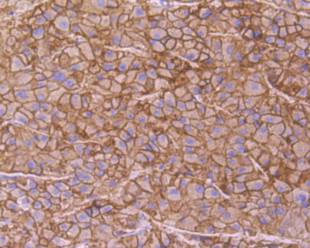 Immunohistochemical analysis of paraffin-embedded human liver tissue using anti-CD166 antibody. The section was pre-treated using heat mediated antigen retrieval with Tris-EDTA buffer (pH 8.0-8.4) for 20 minutes.The tissues were blocked in 5% BSA for 30 minutes at room temperature, washed with ddH2O and PBS, and then probed with the primary antibody (EM1902-36, 1/100) for 30 minutes at room temperature. The detection was performed using an HRP conjugated compact polymer system. DAB was used as the chromogen. Tissues were counterstained with hematoxylin and mounted with DPX.