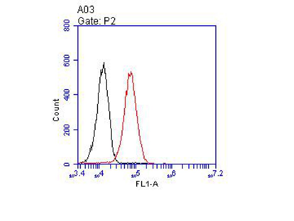 Flow cytometric analysis of CD166 was done on THP-1 cells. The cells were fixed, permeabilized and stained with the primary antibody (EM1902-36, 1/100) (red). After incubation of the primary antibody at room temperature for an hour, the cells were stained with a Alexa Fluor 488-conjugated goat anti-Mouse IgG Secondary antibody at 1/500 dilution for 30 minutes.Unlabelled sample was used as a control (cells without incubation with primary antibody; black).