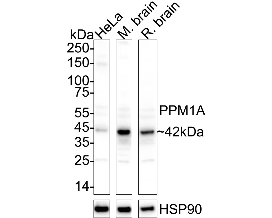 Western blot analysis of PPM1A on different lysates with Rabbit anti-PPM1A antibody (ER1706-37) at 1/5,000 dilution.