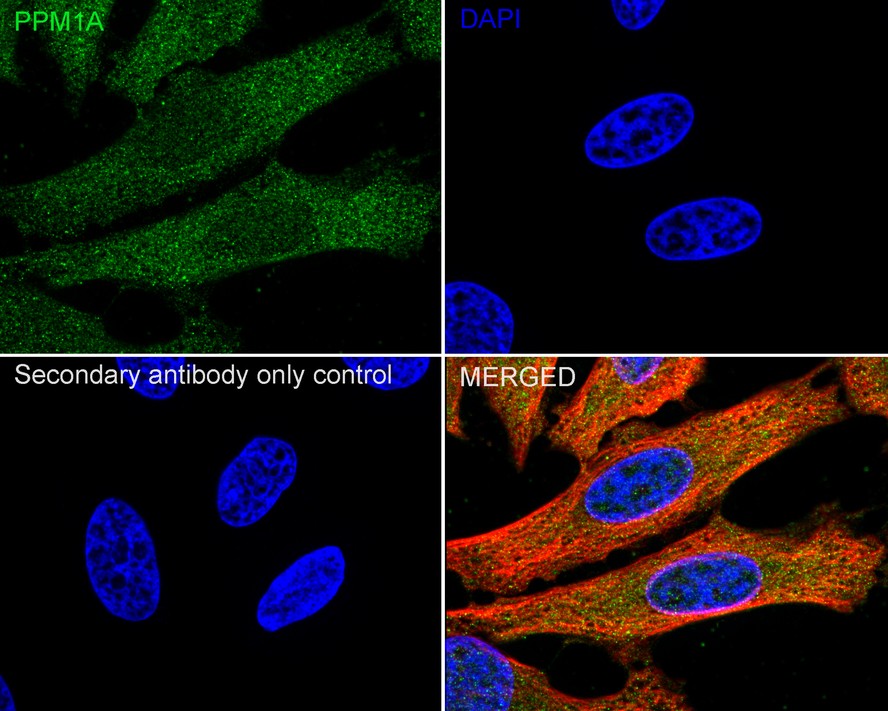 Cells were fixed in 4% paraformaldehyde for 15 minutes at room temperature, permeabilized with 0.1% Triton X-100 in PBS for 15 minutes at room temperature, then blocked with 1% BSA in 10% negative goat serum for 1 hour at room temperature. Cells were then incubated with Rabbit anti-PPM1A antibody (ER1706-37) at 1/100 dilution in 1% BSA in PBST overnight at 4 ℃. Goat Anti-Rabbit IgG H&L (iFluor™ 488, HA1121) was used as the secondary antibody at 1/1,000 dilution. PBS instead of the primary antibody was used as the secondary antibody only control. Nuclear DNA was labelled in blue with DAPI.