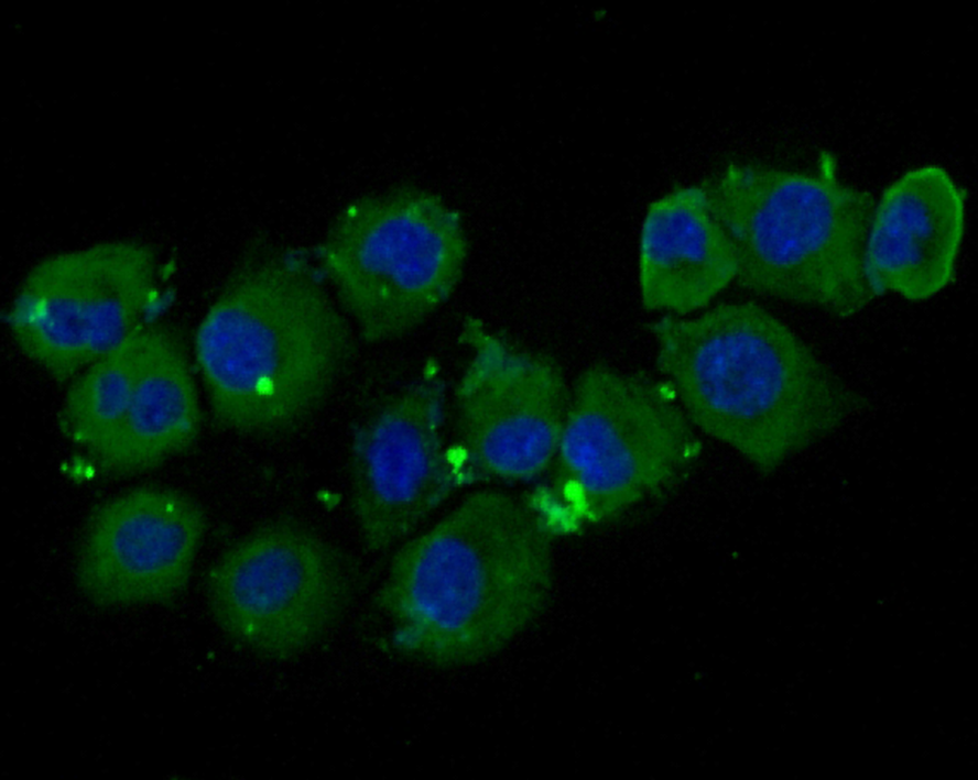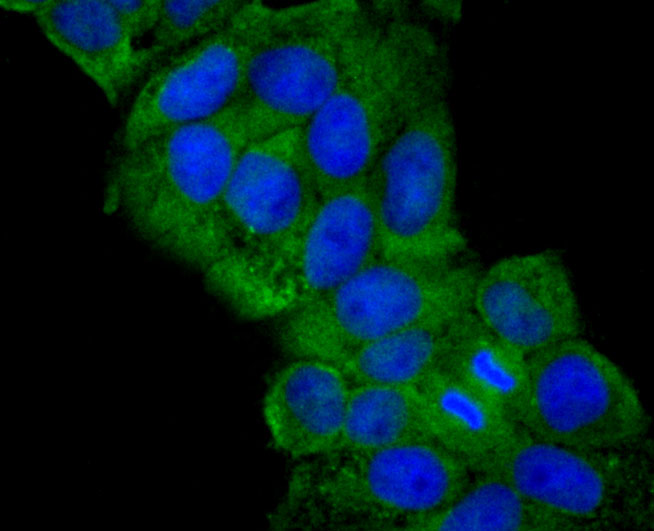 Cells were fixed in 4% paraformaldehyde for 10 minutes at 37 ℃, permeabilized with 0.05% Triton X-100 in PBS for 20 minutes, and then blocked with 2% negative goat serum for 30 minutes at room temperature. Cells were then incubated with Rabbit anti-JAK2 antibody (ER1706-58) at 1/50 dilution in 2% negative goat serum overnight at 4 ℃. Goat Anti-Rabbit IgG H&L (iFluor™ 488, HA1121) was used as the secondary antibody at 1/1,000 dilution. PBS instead of the primary antibody was used as the secondary antibody only control. Nuclear DNA was labelled in blue with DAPI.