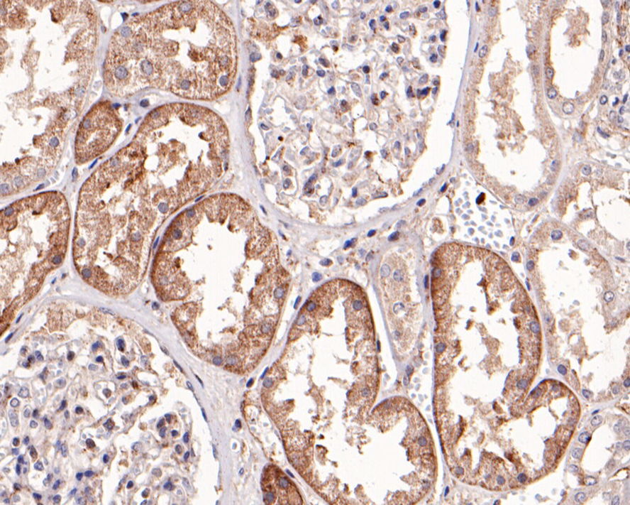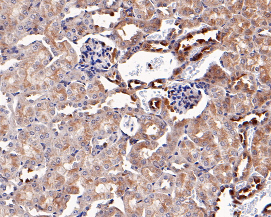 Immunohistochemical analysis of paraffin-embedded mouse kidney tissue with Rabbit anti-JAK2 antibody (ER1706-58) at 1/400 dilution.
