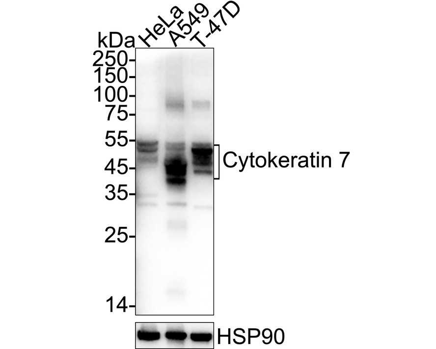 Western blot analysis of Cytokeratin 7 on different lysates. Proteins were transferred to a PVDF membrane and blocked with 5% BSA in PBS for 1 hour at room temperature. The primary antibody was used at a 1:500 dilution in 5% BSA at room temperature for 2 hours. Goat Anti-Rabbit IgG - HRP Secondary Antibody (HA1001) at 1:5,000 dilution was used for 1 hour at room temperature.