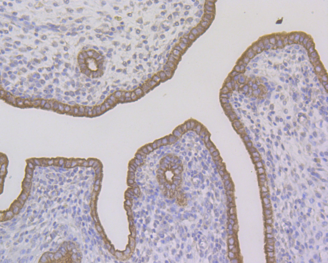 Immunohistochemical analysis of paraffin-embedded rat uterus tissue using anti-Cytokeratin 7 antibody. The section was pre-treated using heat mediated antigen retrieval with Tris-EDTA buffer (pH 8.0-8.4) for 20 minutes.The tissues were blocked in 5% BSA for 30 minutes at room temperature, washed with ddH2O and PBS, and then probed with the antibody (ER1803-89) at 1/50 dilution, for 30 minutes at room temperature and detected using an HRP conjugated compact polymer system. DAB was used as the chromogen. Counter stained with hematoxylin and mounted with DPX.