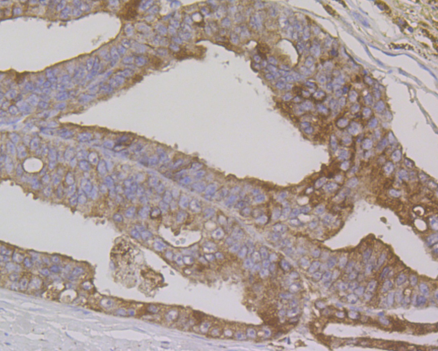 Immunohistochemical analysis of paraffin-embedded human prostate cancer tissue using anti-Cytokeratin 7 antibody. The section was pre-treated using heat mediated antigen retrieval with Tris-EDTA buffer (pH 8.0-8.4) for 20 minutes.The tissues were blocked in 5% BSA for 30 minutes at room temperature, washed with ddH2O and PBS, and then probed with the antibody (ER1803-89) at 1/50 dilution, for 30 minutes at room temperature and detected using an HRP conjugated compact polymer system. DAB was used as the chromogen. Counter stained with hematoxylin and mounted with DPX.